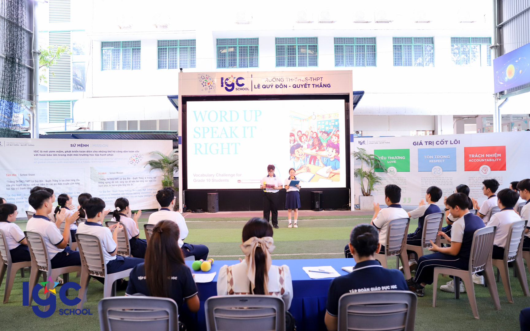 Chương trình “WORDUP 10: Speak It Right” đã mang đến cho học sinh Khối 10 một sân chơi tiếng Anh sôi động, nơi các em được thử sức với các thử thách phát âm, đánh vần và ghi nhớ từ vựng trong không khí thi đua hào hứng, tự tin và tràn đầy năng lượng.